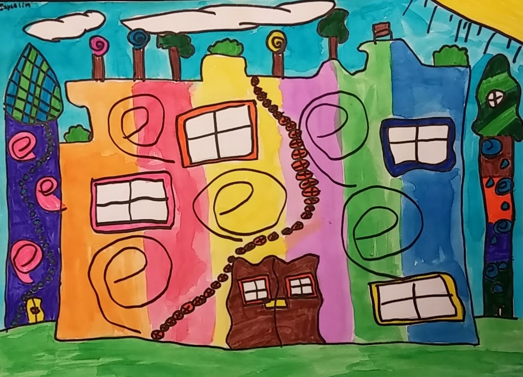I did tell the kids that I would at least like them to paint the biggest areas with liquid watercolor paint both to save ink and for contrast. The smaller details and patterns were done with marker for accuracy. I did print out a handout with pictures of Hundertwassar's artwork. The kids used it for inspiration for their own artistic interpretations.